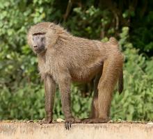 A baboon climbed the trees in search of fruit - Con khỉ đầu chó leo lên cây để tìm trái cây.